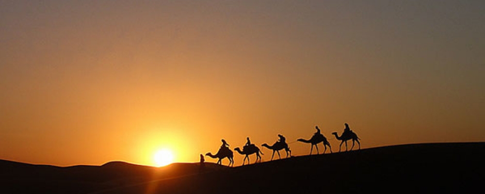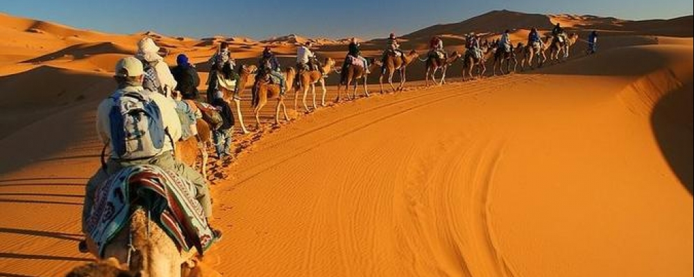 Petit déjeuner, une heure à dos de chameaux au lever du soleil. Départ de Merzouga en direction de Marrakech. Arrivée vers 19h30.