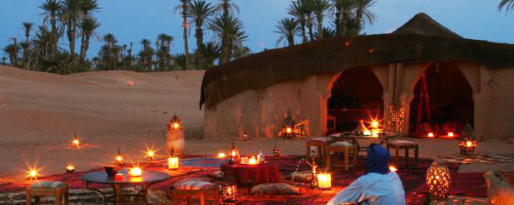 Petit déjeuner à l'hôtel. Départ des Gorges de Dadès pour la visite des Gorges de Todra. En suite direction vers les grandes dunes de Merzouga, une heure à dos de chameaux au coucher du soleil, puis installation et dîner sous tente nomade en plein désert.