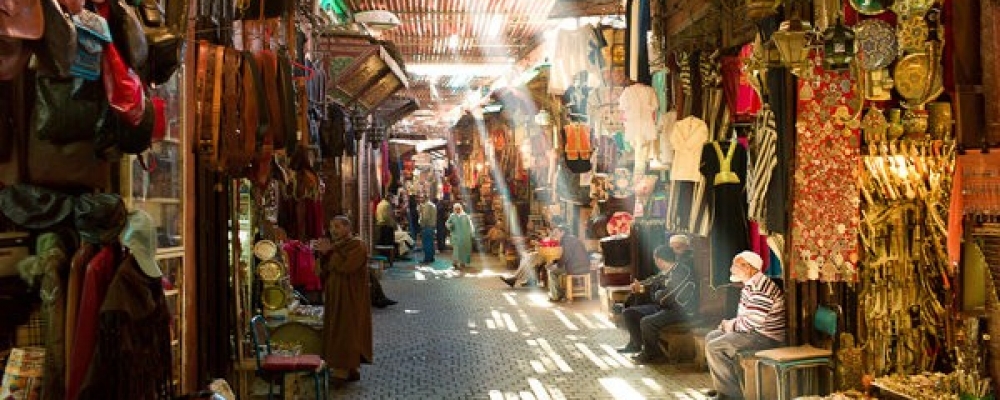 Serrés au cœur de Marrakech, traditionnelle, turbulence de la vie économique, où tout est caché et pourtant tout se voit .Au hasard des ruelles étroites, les artisans plus artistes y sont installés par corporations : bijoutiers, teinturiers, forgerons, ébénistes,…Senteurs des épices et des herbes, couleurs et bruits ; dans les Souks on achète, on troque, on fabrique.